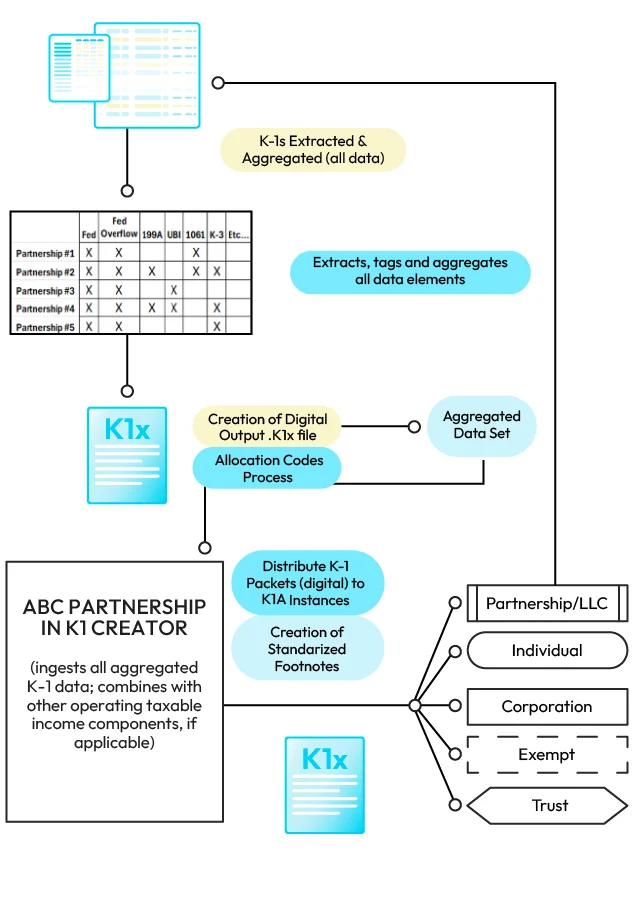 • Out: consumable and investor-ready K-1 data, machine-readable schedules, and, if needed, a human-friendly PDF generated from the canonical record.
